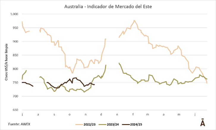 El mercado lanero australiano cerró esta última semana con el Indicador de Mercados del Este (IME) en US$ 7,43, perdiendo tres centavos, pero se ha mantenido relativamente estable en esta zafra, con una variación diaria que no supera los 14 centavos, tanto al alza como a la baja. En este sentido la primera venta de la zafra, el 2 de julio, el indicador cotizó en US$ 7,50, es decir que más allá de la sensación, se ha perdido únicamente siete centavos.