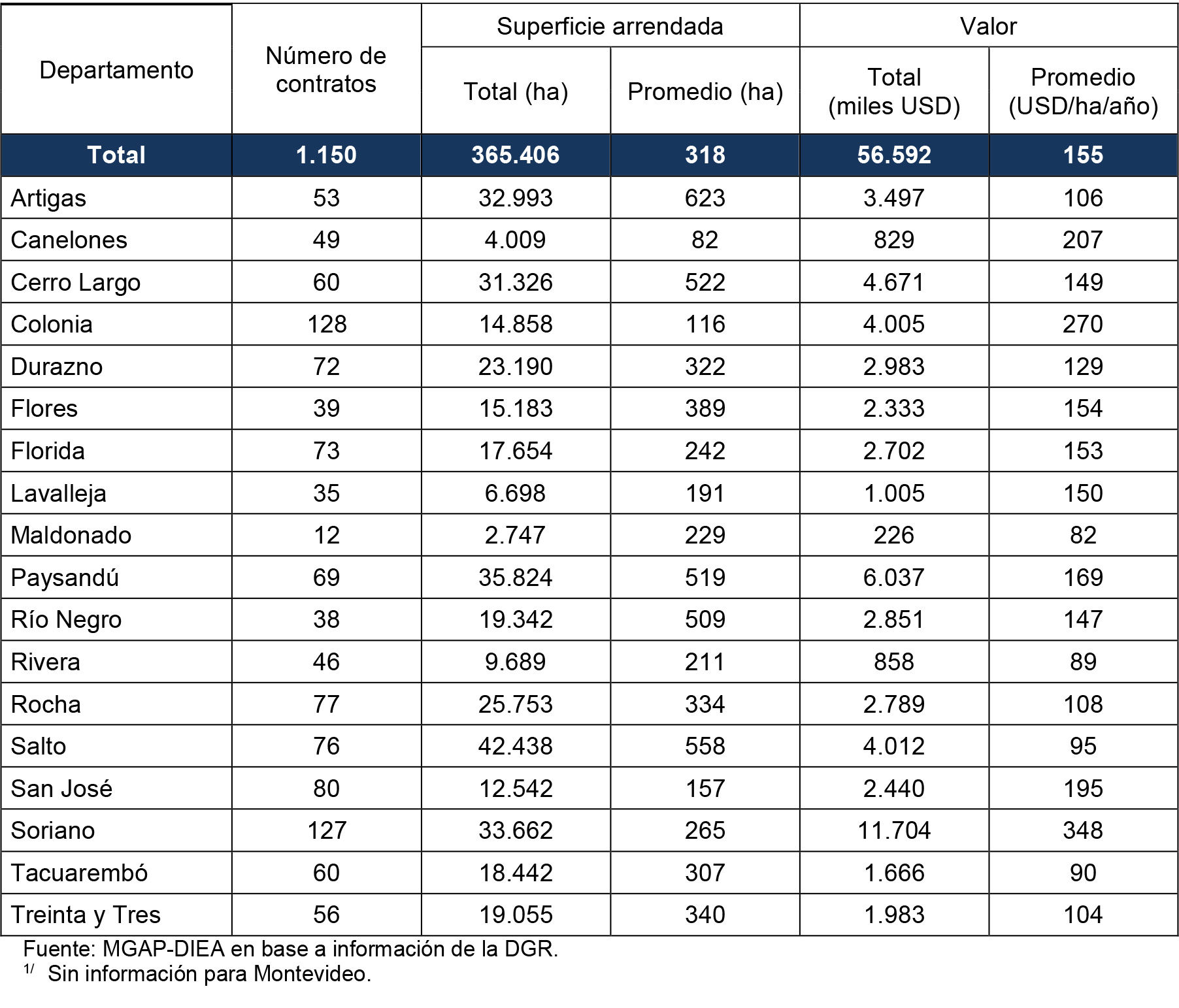 Estos tres departamentos acumulan casi 112 mil hectáreas, representando el 31% del área arrendada total, con un monto que superó los 21 millones de dólares.