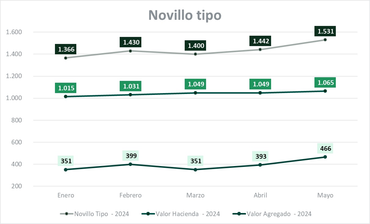 Durante mayo 2024, el valor agregado industrial (que incluye costos y beneficios de la industria) fue lo que registró mayores incrementos a la interna del indicador, ya que posicionado en US$ 466 por cabeza, representó una suba del 18,6% mensual (+73 dólares). Por su parte, el valor de hacienda recibido por el productor también sube, en este caso un 1,5% situándose en US$ 1.065 por cabeza (+16 dólares).