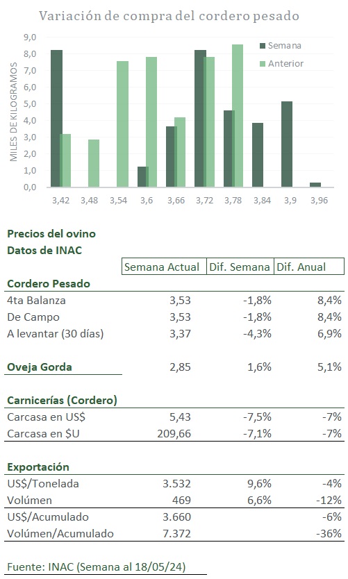 Según los datos del Instituto Nacional de Carnes (INAC), los precios del ovino presentan un incremento del 8% en el caso del cordero y del 5% en la oveja respecto a 2023, mientras que tanto la tonelada exportada como los precios en el abasto interno también descienden.