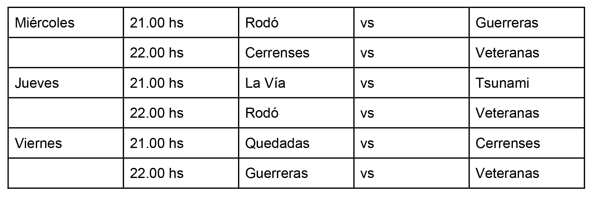 La Copa de Oro la están disputando los equipos de Pistoleras, Rebeldes, La Vía y Tsunami; mientras que la Copa de Plata la juegan los equipos de Rodó, Las Cerrenses, Veteranas, Guerreras y el equipo de Quedadas.