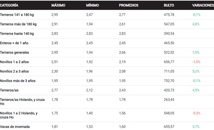 Las vacas de invernada, por su parte, registraron un precio promedio de US$ 1,60, reflejando un incremento del 3,7%.