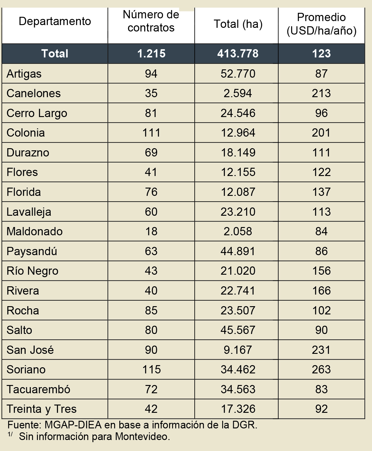 Por regiones, los departamentos ganaderos como Artigas, Salto y Paysandú lideraron en superficie arrendada, acumulando el 35 % del total, pero con precios moderados de 87 a 90 dólares por hectárea. En contraste, departamentos agrícolas como Soriano y San José registraron los valores más altos, alcanzando hasta 263 dólares por hectárea.