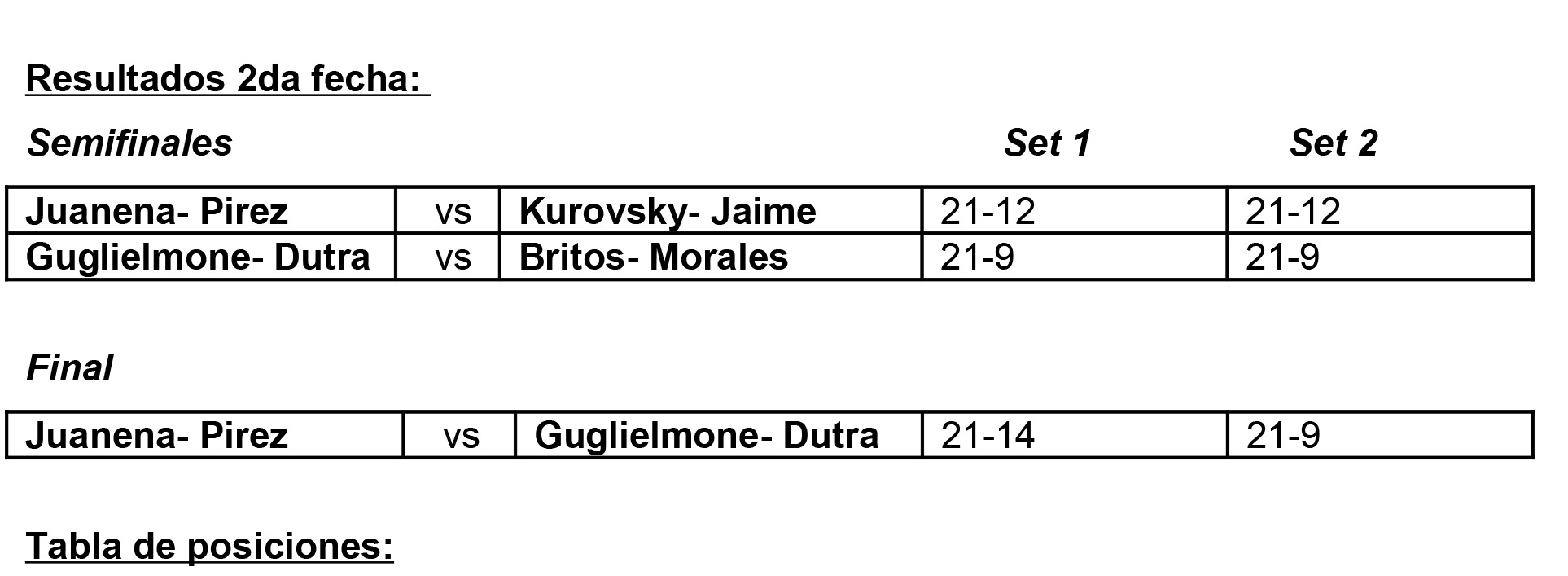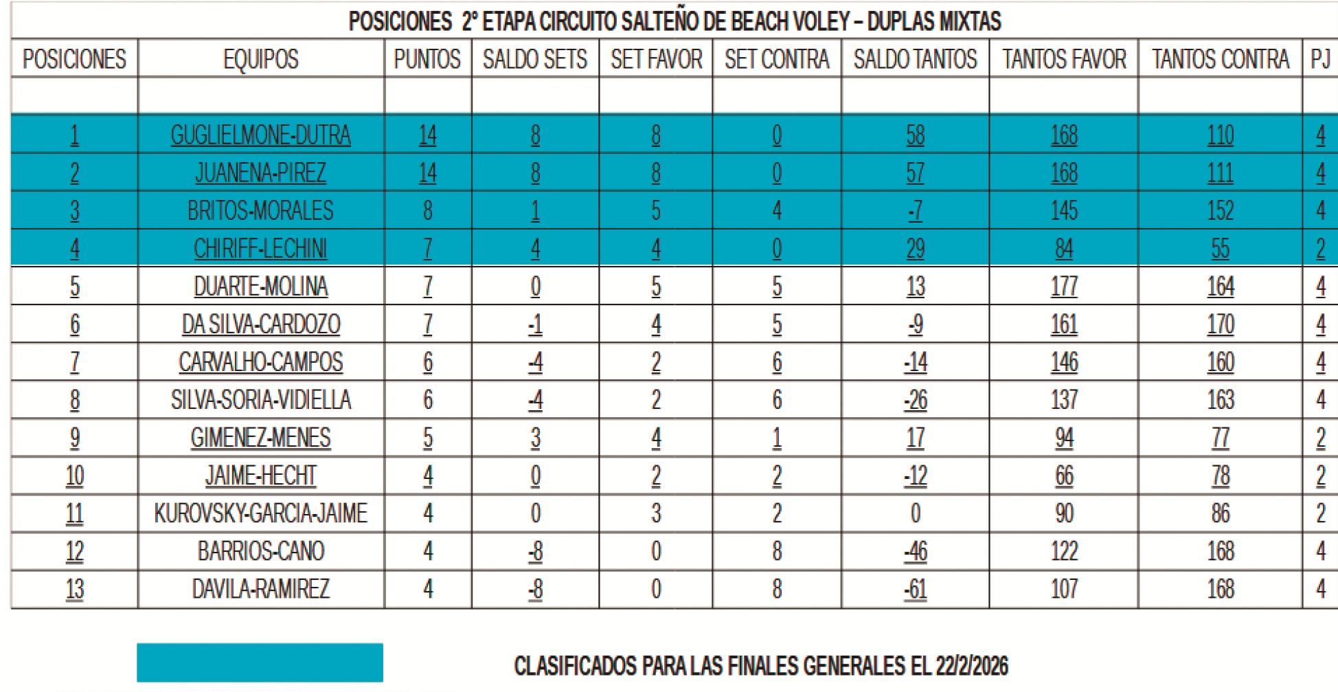 De esta manera ambas duplas son las líderes de la tabla de posiciones, y a su vez las 2 duplas recién mencionadas, más Britos- Morales y Chiriff Lequini que están en 3er y 4to lugar de la tabla de posiciones, yá están clasificadas a la fase final del 22 de febrero.